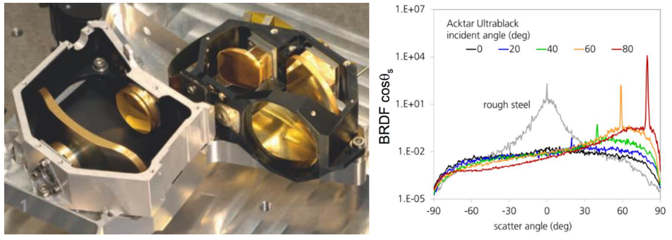 圖4. 近紅外下對Acktar[1]黑色涂層的散射測量,左圖:用于BepiColombo太空任務(wù)的紅外光譜儀;右圖:4.6下ARS角分辨散射分布,入射角0°,10°,40°,60°,80°。