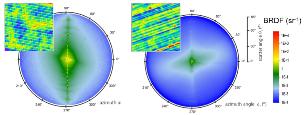 圖5. 金剛石車削的鋁反射鏡,金剛石打磨的Al鏡的3D光散射分布及其白光干涉儀的表面形貌測量:左圖:車削痕跡引起的衍射為主的散射分布;右圖:振動引起的衍射峰被抑制而入射面外散射增強的散射分布。
