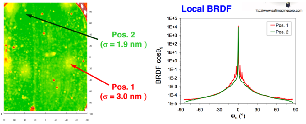 圖6. 金剛石打磨拋光鋁鏡的散射掃描及其相應(yīng)位置的ARS測量,左圖: 散射掃描@532nm,散射角25°,樣本大小200*160mm2;右圖:相應(yīng)位置ARS測量。