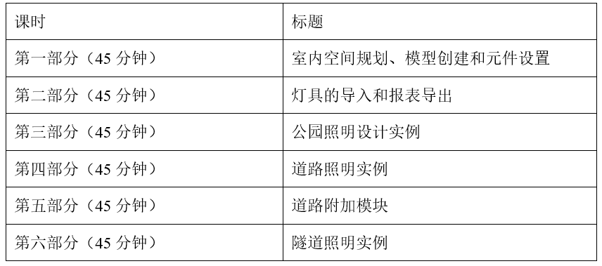 本課程的目的在于通過一些室內(nèi)照明、室外照明、道路照明和隧道照明實例使用戶能更熟練的使用軟件進行照明設(shè)計。