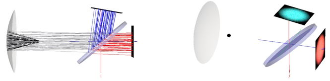 寬光譜光源對許多光學(xué)系統(tǒng)都很重要,應(yīng)用范圍包括白光照明、分光計等。FRED中的顏色圖像分析,是通過計算每個像素的色度坐標(biāo)并在表面上顯示生成的RGB值來生成顏色分布。此外,F(xiàn)RED還可以顯示彩色色度圖,并在用戶移動光標(biāo)時指示每個像素的色度坐標(biāo)。在本案例中,將觀察兩個光學(xué)系統(tǒng)的彩色圖像。第一個系統(tǒng)包括一個分色的“冷光鏡”,將白光分為兩個波長段。第二個系統(tǒng)利用線偏振器和波片來顯示雙折射材料的波長依賴性。