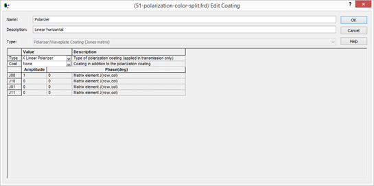 偏振片是通過(guò)偏振鍍膜來(lái)實(shí)現(xiàn)的,如下新建偏振鍍膜。右擊鍍膜文件夾,新建鍍膜,類型選擇偏振/波片鍍膜瓊斯矩陣(Polarizer/Waveplate Coating jones matrix),然后默認(rèn)的就是沿x軸偏振鍍膜。
