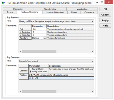右擊光源文件夾并選擇新建詳細(xì)光源。命名為Diverging beam,光源的類型選擇為六邊形平面,方向選擇從某點(diǎn)發(fā)出,并且把這一點(diǎn)選在z軸負(fù)軸的某一點(diǎn)(0,0,-20)。設(shè)置光源設(shè)為相干光,在偏振(polarization)選項(xiàng)卡里設(shè)置光源偏振類型和方向?yàn)榫性偏振,方向?yàn)閤軸方向(下面通過(guò)把光源沿z軸選擇-45度來(lái)調(diào)整偏振方向,當(dāng)然也可以在這里設(shè)置偏振方向?yàn)槟骋粋(gè)特定點(diǎn)方向,但是用前一種方法在需要改變光源偏振方向時(shí)會(huì)更方便一些)。然后設(shè)置光源位置和旋轉(zhuǎn),將光源位置設(shè)置在(0,0,-3),沿z軸選擇-45度。