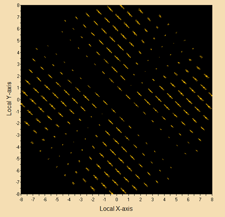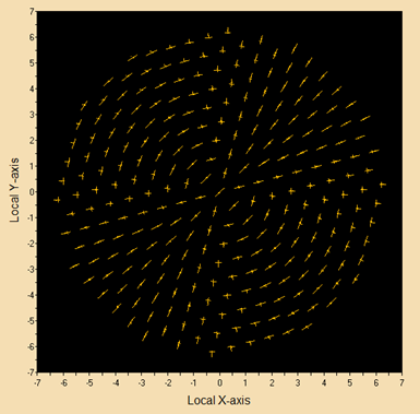 在 Analysis/Polarization Spot Diagram (Ctrl+Shift+L) 里查看分析面上的光線偏振情況,應(yīng)該都是方向?yàn)?45度的線偏光,如下圖所示。也可以將接收面移動(dòng)到偏振片之前,將接受面沿z軸的偏移量從10 單位長(zhǎng)度調(diào)整到3,查看一下這里光線的偏振情況。可以看到o光和e光在同一傾斜角,不同方位角時(shí)分量會(huì)不同。