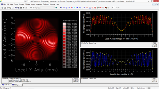 偏振光干涉現(xiàn)象在實(shí)際中有很多應(yīng)用,這里要模擬的是一種典型的雙折射干涉實(shí)驗(yàn),設(shè)置如下圖所示:左側(cè)是偏振光源,偏振方向是在xy平面且與x軸夾角45度,所有光線的反向延長(zhǎng)線指向一點(diǎn)。接下來(lái)光線經(jīng)過(guò)方解石平板,厚2mm,光軸方向沿z 軸。然后光線通過(guò)偏振片,偏振片方向與光源方向垂直(xy 平面,與x 夾角-45度),偏振片是通過(guò)設(shè)置偏振鍍膜來(lái)實(shí)現(xiàn)的。最右邊是接收分析面,光線在這里停止,用來(lái)計(jì)算光強(qiáng)。