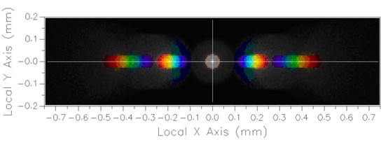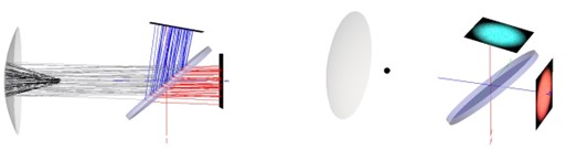 寬光譜光源對許多光學系統(tǒng)都很重要,應用范圍包括白光照明、分光計等。FRED中的顏色圖像分析,是通過計算每個像素的色度坐標并在表面上顯示生成的RGB值來生成顏色分布。此外,F(xiàn)RED還可以顯示彩色色度圖,并在用戶移動光標時指示每個像素的色度坐標。在本案例中,將觀察兩個光學系統(tǒng)的彩色圖像。第一個系統(tǒng)包括一個分色的“冷光鏡”,將白光分為兩個波長段。第二個系統(tǒng)利用線偏振器和波片來顯示雙折射材料的波長依賴性。