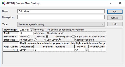 FRED中可以指定幾種膜層類型,例如采樣膜層,薄膜膜系,四分之一波長單層膜層,一般采樣膜層(入射角,波長和偏振相關),偏振片/波片膜層(瓊斯矩陣) 和腳本膜層。 在此案例中,使用Thin Film Layered Coating類型(圖1)創(chuàng)建冷鏡。