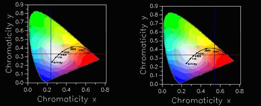 圖5. 圖中十字線表示的光束反射(左)和透射(右)分量的平均色度坐標。通過將分析面減少到一個像素并評估其彩色圖像來確定該值。