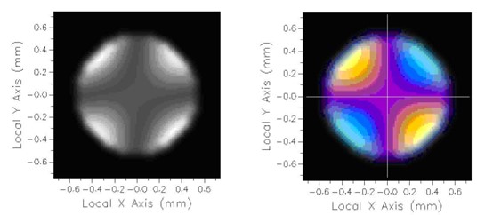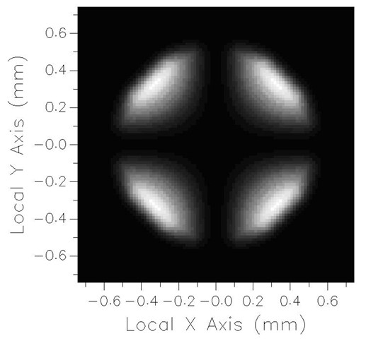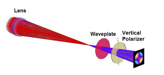 在該系統(tǒng)中,相干的水平偏振白光由透鏡聚焦。波片放置在焦點之外,然后是垂直線偏振片(圖6)。準直的水平偏振光不通過偏振片,然而,水平偏振光線的擴展光束在每個角落處具有一些通過的垂直偏振分量。圖7顯示了沒有波片系統(tǒng)的輻照度。