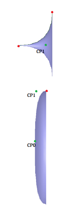 圖2.導(dǎo)光管側(cè)面視圖,綠色的點(diǎn)(CP0, CP1)是將要在優(yōu)化中被修改的控制點(diǎn)