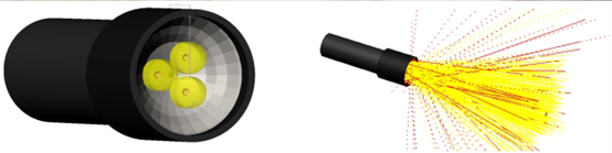 圖1 左:FRED中的手電筒模型。該模型由筒身、多面反射鏡和排列的三個(gè)白光LED組成。右:手電筒光線軌跡示意圖。由面反射鏡反射的光線顯示為紅色。