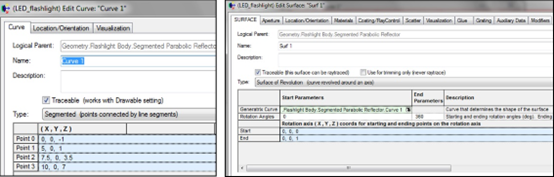 為了提高光學(xué)效率,面反射鏡恰好可以放置在LED后面。使用“自定義元件”可以創(chuàng)建該反射鏡,自定義元件由兩部分組成:一條曲線和一個(gè)表面。分段曲線需要每個(gè)間斷點(diǎn)的(X,Y,Z)坐標(biāo),用于定義反射鏡的徑向分布。該曲線在X-Z平面具有拋物線形狀,Z值正比于X^2。然后將分段曲線指定為旋轉(zhuǎn)曲面的母線。分段反射鏡曲線和表面的準(zhǔn)確參數(shù)如圖2所示,以及已完成的反射鏡的示意圖。