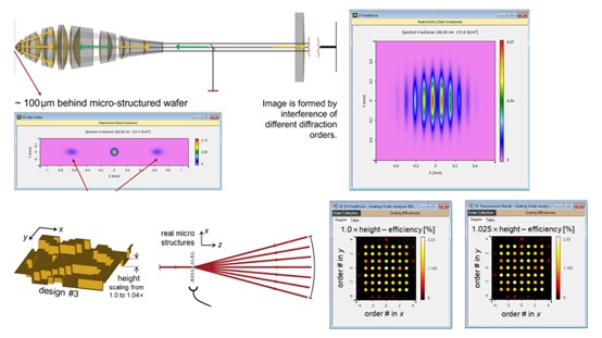 這種類型的復(fù)雜系統(tǒng)是快速物理光學(xué)建模和設(shè)計(jì)軟件VirtualLab Fusion的最強(qiáng)組合之一:其非序列的“connecting field solvers”技術(shù)使您可以將FMM用于系統(tǒng)中的光柵,另一個(gè)求解器用于自由空間中的傳播,還有一個(gè)求解器用于透鏡,每個(gè)求解器都依賴于對(duì)應(yīng)用它的元件有意義的假設(shè)。對(duì)光電磁模型的堅(jiān)持使用意味著在模擬中考慮了復(fù)雜的矢量行為(例如,來自光柵的偏振效應(yīng)與強(qiáng)聚焦光中的強(qiáng)縱向分量相結(jié)合)。