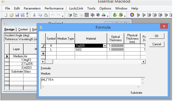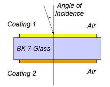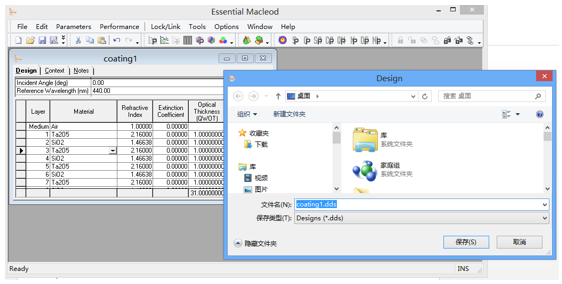 該系統(tǒng)如圖1-1所示。將該系統(tǒng)輸入到一個(gè)堆棧文件中,我們首先要說明它有三層介質(zhì),入射介質(zhì)是空氣,緊接著是玻璃介質(zhì),最后的出射介質(zhì)也是空氣。在玻璃介質(zhì)的前表面鍍膜1。雖然實(shí)際上,膜2是鍍?cè)诓AЫ橘|(zhì)的后表面,但在導(dǎo)入堆棧中時(shí)我們將膜2視為鍍?cè)诳諝獬錾浣橘|(zhì)的前表面。這意味著在該例子中,第二膜層設(shè)計(jì)時(shí)假定入射介質(zhì)是玻璃,出射介質(zhì)和基底是空氣。這顯然是不對(duì)的,因?yàn)樵O(shè)計(jì)文件中要求入射介質(zhì)是空氣,基底是玻璃。為了糾正這一點(diǎn),我們要確定膜層方向(Coating Direction)輸入的是反向(Reversed),實(shí)際上,堆棧文件通常會(huì)自動(dòng)處理。
