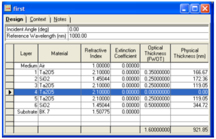 圖2給出了一個測試Design。它并不是一個合適的OLED模型。層4厚度為零并且被自動選擇為發(fā)射層。