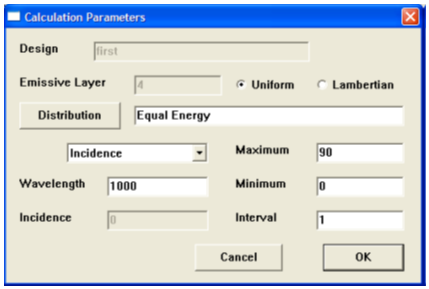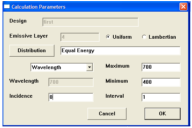 圖3和圖4給出了計算參數(shù)對話框。Design名字和emissive layer都不可編輯,僅供參考。如果選擇了正確的自變量或是腳本的默認(rèn)值,則相關(guān)參數(shù)從design文件中讀取,它們可在對話框中編輯。點擊Distribution按鈕會允許一個發(fā)射層波長與輸出關(guān)系的表格以供選擇。如果不做選擇則默認(rèn)使用Equal Energy。