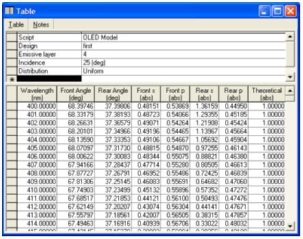 圖7. 結(jié)果表格。front angle是前向介質(zhì)中出射的光的傳播角度。rear angle是后向介質(zhì)中出射的光的傳播角度。theoretical列是從發(fā)射材料的輸出分布,這里是常數(shù)是因為是均勻輸出。