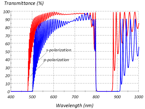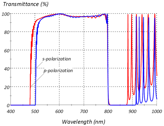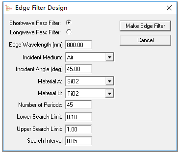Design Tool中,EdgeFilter的功能是可以用來幫助設(shè)計邊緣濾波器的結(jié)構(gòu)。一個簡單的邊緣濾波器是基于四分之一堆棧的,在基板和入射介質(zhì)旁邊的幾個匹配層可以用來抑制通帶波紋。當(dāng)傾斜時,高反射率區(qū)的寬度對S偏振光有增大的趨勢,對P偏振光有減小的趨勢,導(dǎo)致偏振分離。四分之一波長堆棧不容易得到顯著改善,但是Thelen 已經(jīng)表明五層對稱周期是可以作為邊緣濾波器的基礎(chǔ)的,其中p和s偏振邊緣可以重合。嚴格來說,這只是在一個入射角,但經(jīng)驗表明,在一定角度范圍內(nèi)分裂非常小。邊緣濾波器工具可以找到這樣一個對稱的周期,并設(shè)計一個非偏振邊緣濾波器。該工具使用迭代技術(shù)來識別所有可能的組合,并找到通帶寬度和禁帶寬度的最佳組合,但是后者受到一定限制。