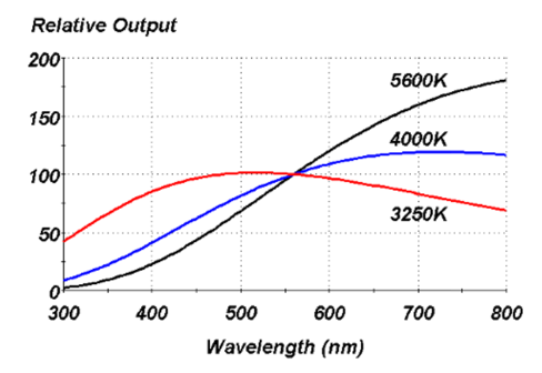 圖1.幾種不同黑體光源的相對輸出。與正常情況一樣,曲線在560納米處被標準化為100。