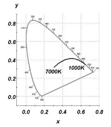 圖2.顯示從1000K到7000K的普朗克軌跡的色度圖