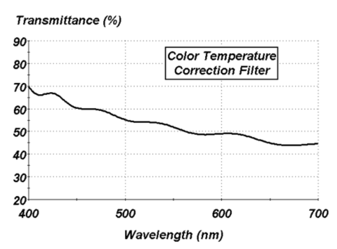 圖4.彩色校正濾光片的透射比,設計用于將3000K黑體特性轉(zhuǎn)換為3300K。這相當于在RCCT(Reciprocal Correlated Color Temperature)下-30rmk(Reciprocal Megakelvin)的變化。
