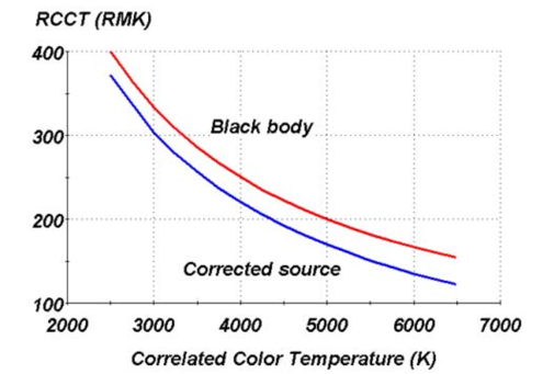 圖5.一系列黑體光源在有色溫校正濾光片和無色溫校正濾光片的情況。幾乎恒定在-30rmk