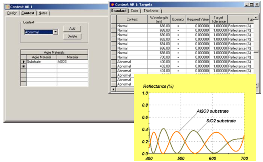 圖2.使用Context屬性的示例。在設(shè)計(jì)文件的Context中,標(biāo)簽基板被聲明為一種敏感材料,在Normal Context中具有材料SiO2的特性,在新添加的Context中具有Al2O3的特性-Abnormal。在normal和abnormal情況下,目標(biāo)被設(shè)置為從400nm到700nm的零反射率,圖中顯示了使用材料MgF2和Ta2O5進(jìn)行優(yōu)化合成的結(jié)果。