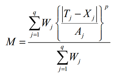 其中M是品質(zhì)因子,T是目標(biāo)值,X是實(shí)際值,A是公差,W是權(quán)重,p是引起誤差的冪數(shù)。