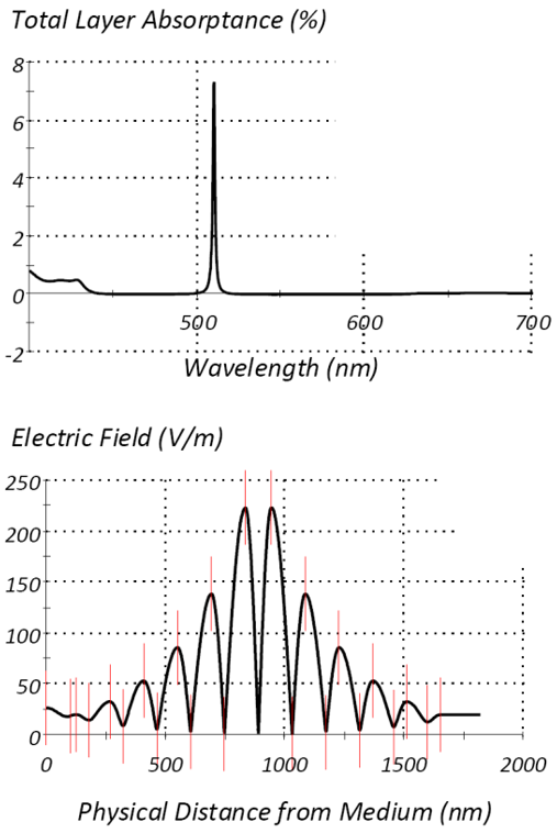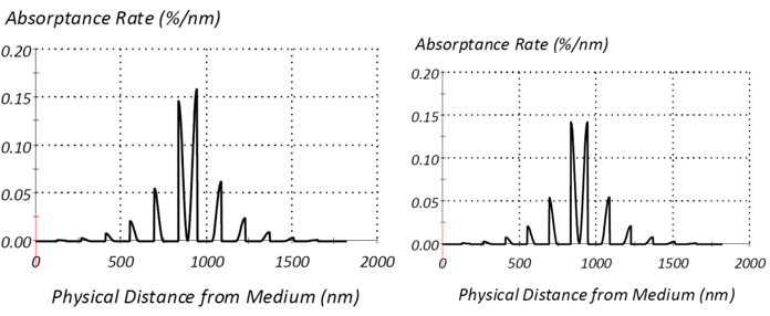 圖1顯示了使用具有無吸收低折射率材料(SiO2)和輕微吸收的高折射率材料(TiO2)薄膜的窄帶濾光片的一些結(jié)果。電場分布的平方很好地解釋了吸收率變化。勢吸收率幾乎相同,因?yàn)榉瓷渎蕿榱,但膜層前面部分的吸收降低了墳(zāi)股系腎enter的值,因此膜層后部的吸收率逐漸增加。