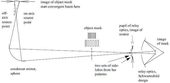 本例介紹了如何上述第二種方法來實現部分相干光的建模。如圖1所示,整體結構是一個科勒照明系統。一個聚光元件將非相干光源傳遞到轉像透鏡的入瞳處。非相干光源照亮物體掩膜面,并在最后的像面上得到適當放大的像。為了對光束合理采樣,光源放在物體掩膜的共軛面處,以便光源具有一定的尺寸,而不是理想點光源。對于具有一定尺寸的光源,它所成的像就是部分相干的。當光源大到可以填滿轉像透鏡入瞳時,其所成的像就將是非相干的。