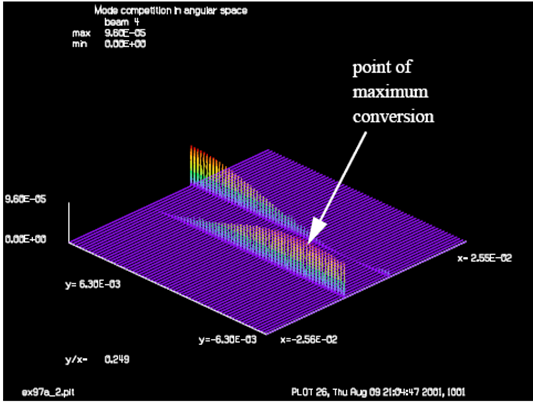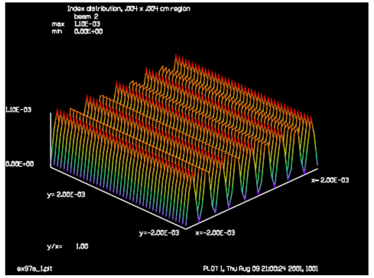 通過將干涉圖樣轉(zhuǎn)換為相位屏,GLAD能夠模擬體全息光柵。在本例中,兩束具有一定夾角的準直光束形成了干涉圖樣。該干涉圖樣對應的強度分布被轉(zhuǎn)化為相位調(diào)制分布。從而用于模擬全息記錄介質(zhì)中形成的梯度折射率分布。體全息結(jié)構(gòu)一旦形成,就可以在傳輸過程中將一束入射光波逐漸轉(zhuǎn)換成形成體全息結(jié)構(gòu)的另一束光波。兩束光波之間的能量傳遞轉(zhuǎn)換效率與體全息結(jié)構(gòu)的厚度密切相關。若厚度很薄,則入射光波轉(zhuǎn)化為另一束的效率很低,隨著厚度逐漸增加,轉(zhuǎn)換效率也隨之增加。到某一厚度時轉(zhuǎn)換效率最大,入射光束完全轉(zhuǎn)換為另一束。但是隨著厚度的進一步增加,能量又會轉(zhuǎn)換回到入射光束。