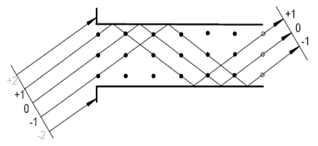 所謂ZIG-ZAG放大器是指光束在同一臺(tái)放大器傳輸多次,獲得多次放大,光束的傳輸路徑呈現(xiàn)之字型。圖1給出了由兩面反射鏡構(gòu)成的ZIG-ZAG放大器。光線-1, 0,+1可以通過ZIG-ZAG放大器進(jìn)行傳輸放大。只有光線經(jīng)過的區(qū)域反轉(zhuǎn)粒子數(shù)才會(huì)被消耗。