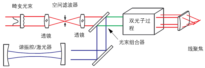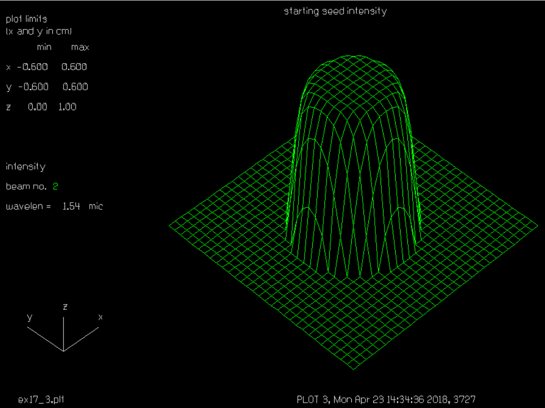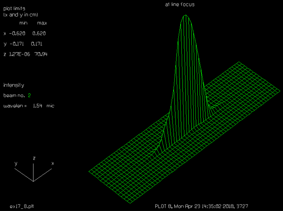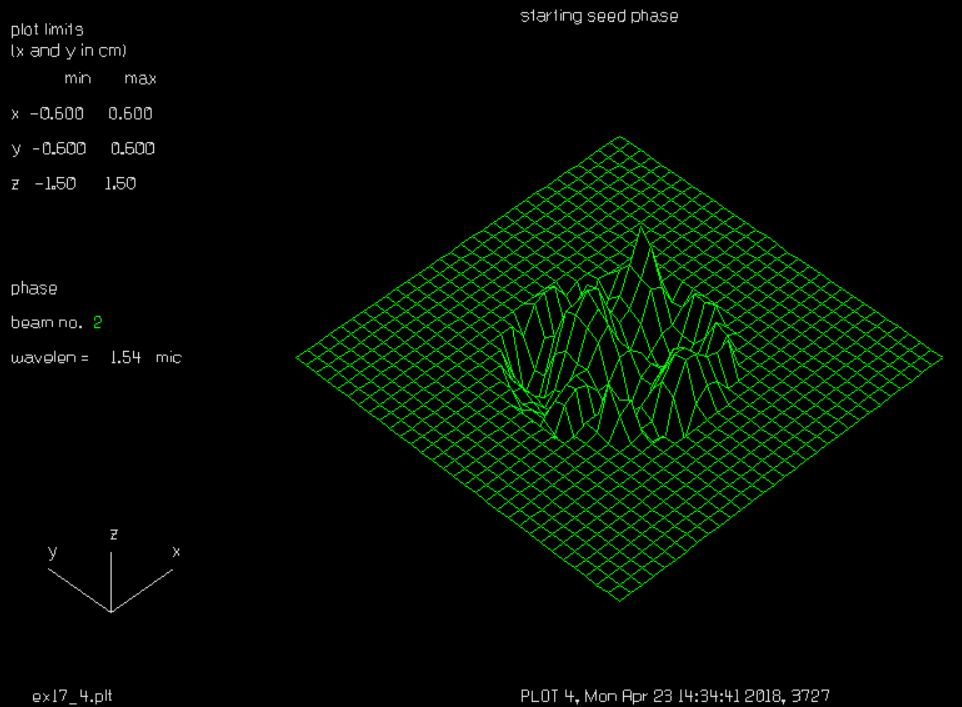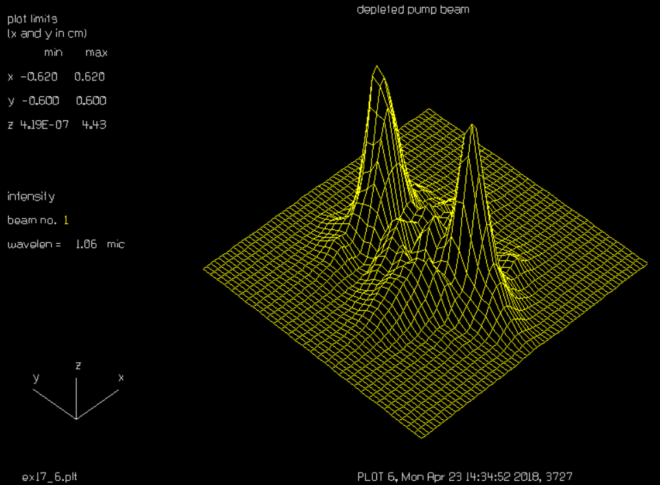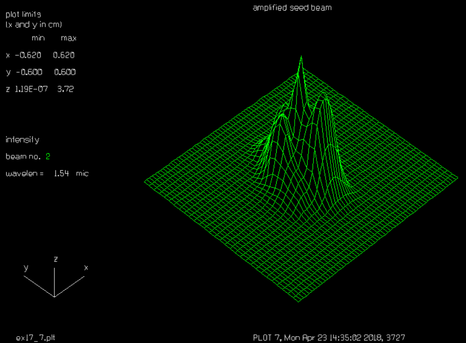 本例說明了通過一束更短的泵浦光對種子光進行拉曼放大的過程。泵浦光波長為1.06u,種子光的波長是1.54u。泵浦光和種子光都有畸變,種子光穿過一個空間濾波器,去除其他光束的干擾。種子光和泵浦光結(jié)合后穿過一個拉曼增益器,放大器衰減泵浦光同時將種子光放大。在這個模型中,泵浦光的任何相位都沒有附加到種子光上。泵浦光和種子光的光強分布反映了光闌邊緣的衍射效應以及光束中的偏差。增益后的種子光輸出經(jīng)過圓柱透鏡聚焦成為一條線光源,可以用于非旋轉(zhuǎn)對稱的光學元件和矩形陣列。值得注意的是,軟件中的編碼自動選擇了矩陣單位的大小從而在兩個方向上都能得到很好的分辨率。