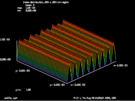 通過將干涉圖樣轉(zhuǎn)換為相位屏,GLAD能夠模擬體全息光柵。在本例中,兩束具有一定夾角的準(zhǔn)直光束形成了干涉圖樣。該干涉圖樣對(duì)應(yīng)的強(qiáng)度分布被轉(zhuǎn)化為相位調(diào)制分布。從而用于模擬全息記錄介質(zhì)中形成的梯度折射率分布。體全息結(jié)構(gòu)一旦形成,就可以在傳輸過程中將一束入射光波逐漸轉(zhuǎn)換成形成體全息結(jié)構(gòu)的另一束光波。兩束光波之間的能量傳遞轉(zhuǎn)換效率與體全息結(jié)構(gòu)的厚度密切相關(guān)。若厚度很薄,則入射光波轉(zhuǎn)化為另一束的效率很低,隨著厚度逐漸增加,轉(zhuǎn)換效率也隨之增加。到某一厚度時(shí)轉(zhuǎn)換效率最大,入射光束完全轉(zhuǎn)換為另一束。但是隨著厚度的進(jìn)一步增加,能量又會(huì)轉(zhuǎn)換回到入射光束。