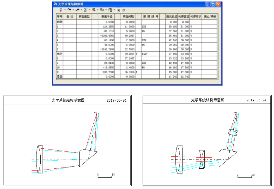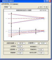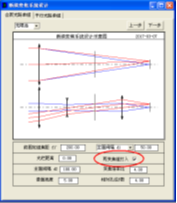 設計時在界面上填寫相關設計要求以及各組元之間主面間隔,程序會自動求解打入部分各組元焦距值以及其他外形尺寸數(shù)據(jù),繪制結(jié)構示意圖。圖中上半部分是打入前的原物鏡結(jié)構,下半部分為打入后的系統(tǒng)結(jié)構。接著執(zhí)行“下一步”程序顯示系統(tǒng)各組元焦距值、通光孔徑以及各組元間主面間隔數(shù)據(jù)。