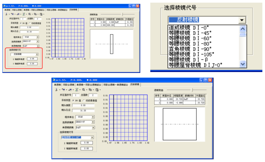 在此界面內(nèi)需要先選擇棱鏡玻璃材料,接著界面變化可以進一步選擇反射棱鏡名稱代號。然后再在系統(tǒng)數(shù)據(jù)表內(nèi)選擇反射棱鏡棱鏡名稱代號。選擇完成有程序自動計算零件光軸展開長度(中心厚度),至此反射棱鏡選擇完成。