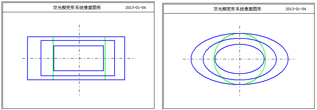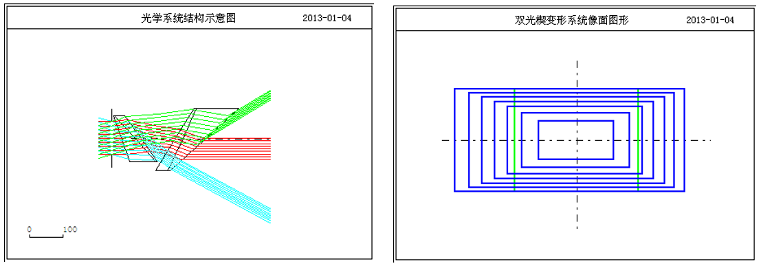 雙光楔變形系統(tǒng)可以作為非對(duì)稱(chēng)擴(kuò)束或圖形變形的雙光楔附加系統(tǒng)。該系統(tǒng)利用雙光楔消色差及兩組膠合光楔的不同傾斜角度,可以改變系統(tǒng)視場(chǎng)角度,再加上光楔子午及弧矢兩個(gè)不同方向的主要使系統(tǒng)在兩個(gè)不同方向上放大倍率不同可以構(gòu)成使像面變寬或變窄的變形系統(tǒng)。雙光楔變形系統(tǒng)被廣泛應(yīng)用于寬銀幕電影(視頻)的拍攝及放映方面極其方便有效。圖1顯示了變形系統(tǒng)在兩個(gè)不同方向的光學(xué)示意圖。圖2顯示了變形系統(tǒng)變形圖像示意圖。左側(cè)為矩形圖像變形,右側(cè)是圓形圖像變形效果圖。圖中紅色圖形為變形前物方原形,藍(lán)色為變形后像方效果。
