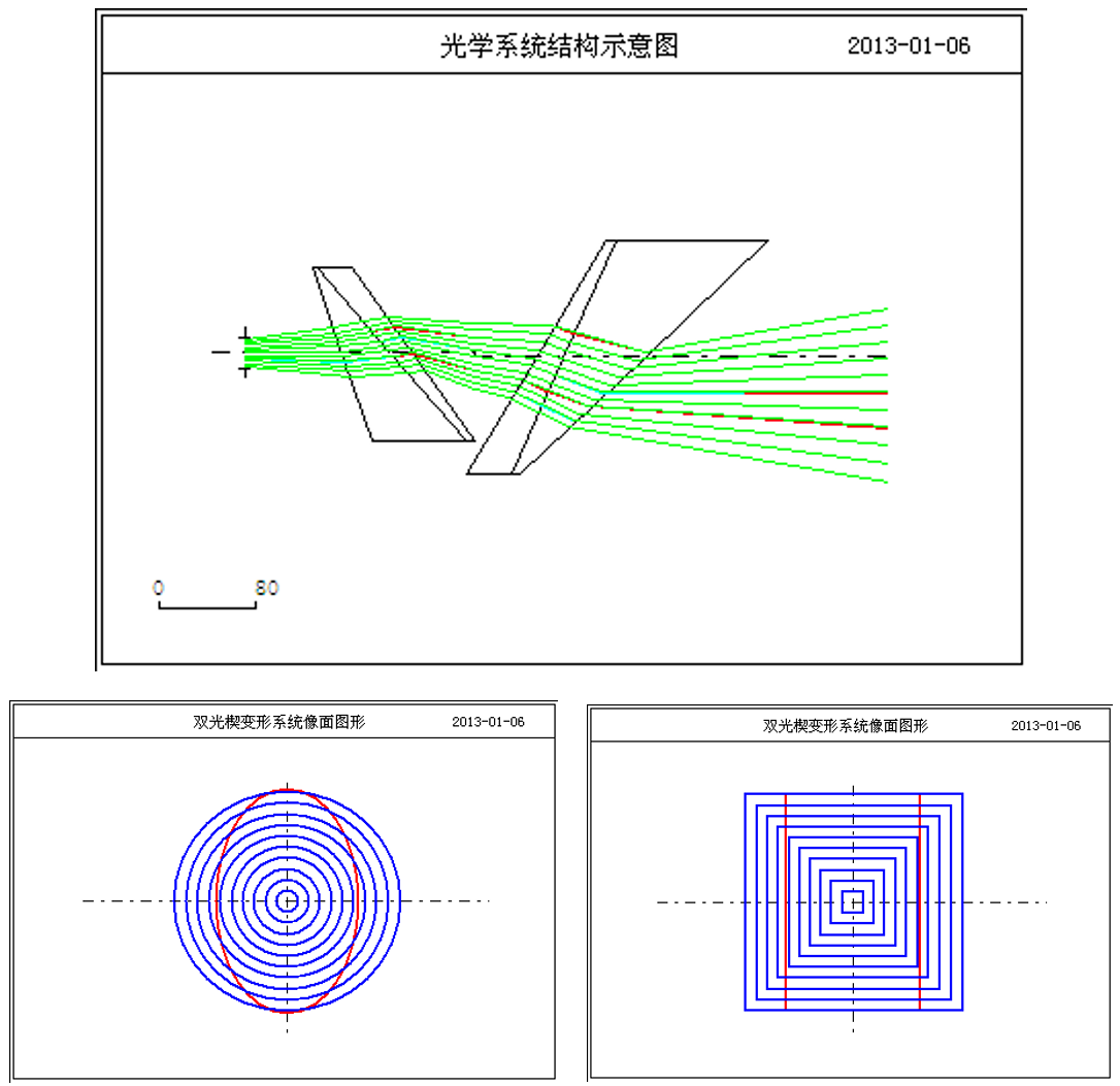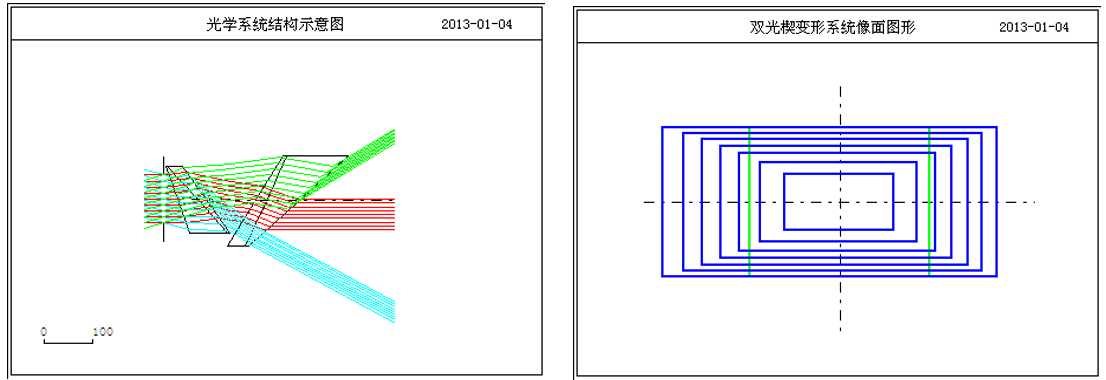 雙光楔變形系統(tǒng)可以作為非對(duì)稱擴(kuò)束或圖形變形的雙光楔附加系統(tǒng)。該系統(tǒng)利用雙光楔消色差及兩組膠合光楔的不同傾斜角度,可以改變系統(tǒng)視場(chǎng)角度,再加上光楔子午及弧矢兩個(gè)不同方向的主要使系統(tǒng)在兩個(gè)不同方向上放大倍率不同可以構(gòu)成使像面變寬或變窄的變形系統(tǒng)。雙光楔變形系統(tǒng)被廣泛應(yīng)用于寬銀幕電影(視頻)的拍攝及放映方面極其方便有效。圖1顯示了變形系統(tǒng)在兩個(gè)不同方向的光學(xué)示意圖。圖2顯示了變形系統(tǒng)變形圖像示意圖。左側(cè)為矩形圖像變形,右側(cè)是圓形圖像變形效果圖。圖中紅色圖形為變形前物方原形,藍(lán)色為變形后像方效果。
