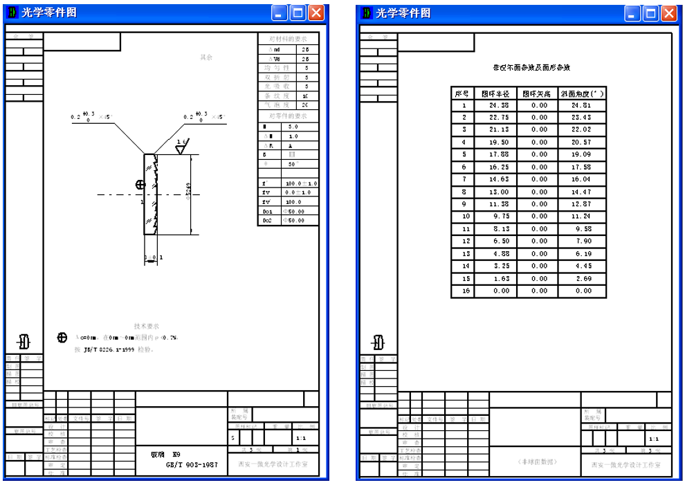 對帶有菲涅爾面型的光學系統(tǒng)(菲涅爾透鏡)設(shè)計完成之后,OCAD 可以像其他非球面鏡一樣繪制各種光學圖紙。在繪制零件圖是還可以繪出菲涅爾面的所有面型參數(shù),如圖5所示。