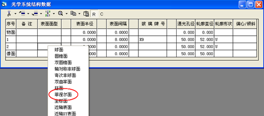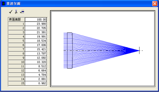 菲涅爾透鏡是一種利用多層環(huán)形圓錐表面構(gòu)成的特殊面型結(jié)構(gòu),用以使光線按預定會聚角會聚的光學元件,他等效于一個球面透鏡,如圖2所示。菲涅爾透鏡多用于要求結(jié)構(gòu)簡單的大孔徑非成像系統(tǒng),特別是照明系統(tǒng)更為常見。這類系統(tǒng)往往只需要一個單片透鏡,工藝簡單可以模壓成形。在對該類透鏡初始結(jié)構(gòu)設(shè)計時利用 OCAD 程序也非常簡單。只要在數(shù)據(jù)表格中的“表面面型”欄內(nèi)選擇“菲涅爾面”,接著界面會出現(xiàn)菲涅爾面型設(shè)計窗體如圖3。在此窗體表格內(nèi)首先 利用其中“下插入”或“刪除”工具按鈕確定菲涅爾面的環(huán)形圈數(shù),再給出菲涅爾面的表面等效焦距值,進一步按“確定”按鈕即可自動算出該菲涅爾面的各環(huán)錐面傾斜角度值。