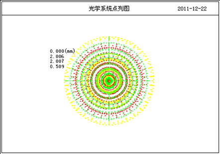 由圖3可以看出,OCAD 在對菲涅爾透鏡自動設(shè)計時可以嚴格把各環(huán)帶中點的光線匯聚于一點,但對于整個環(huán)帶菲涅爾透鏡而言,其橫向像差取決于環(huán)帶寬度,因為就每個環(huán)帶而言只是個平面光錐,只使光線轉(zhuǎn)折不能會聚也不能消色差。菲涅爾透鏡的光斑點列圖如圖4。