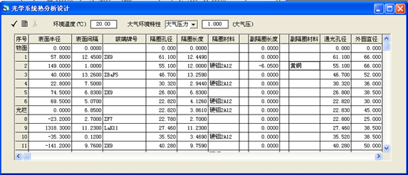 為了適應以上熱平衡效果,在OCAD程序主界面的“編輯”菜單內選取“光學系統(tǒng)熱環(huán)境分析”后會彈出如圖1光學系統(tǒng)熱環(huán)境分析窗體界面。在界面的表格上方給出了“環(huán)境溫度”和“大氣環(huán)境特性”的選擇。其中大氣環(huán)境特性的選擇還有“大氣壓力”和“海拔高度”兩種方式,其實不同海拔高度也就體現了對應大氣壓力,由于不同光學產品面對的要求不同,此兩種選擇方式只是為了適應不同的要求模式而定,程序還可以把海拔高度換算成對應大氣壓力。