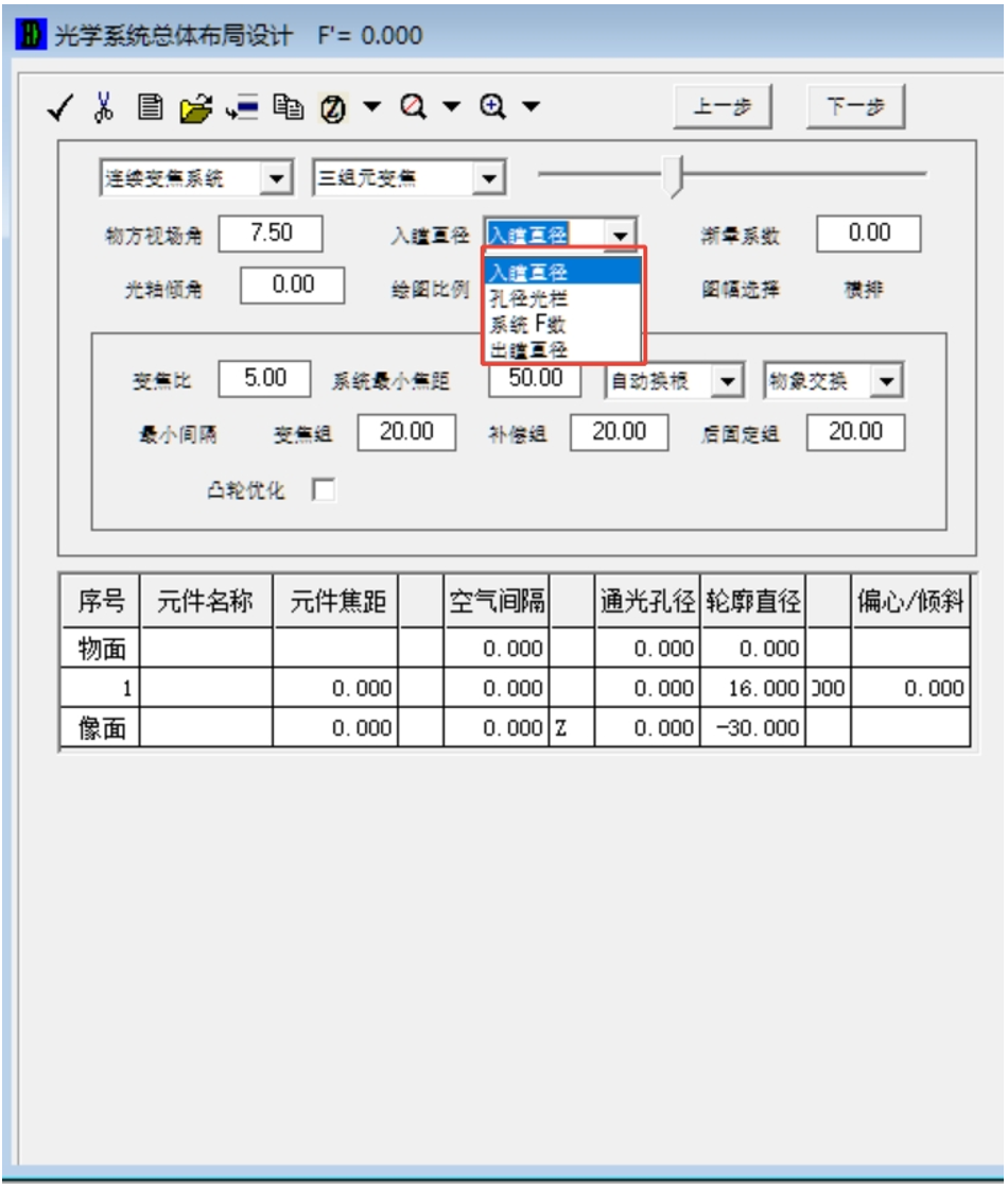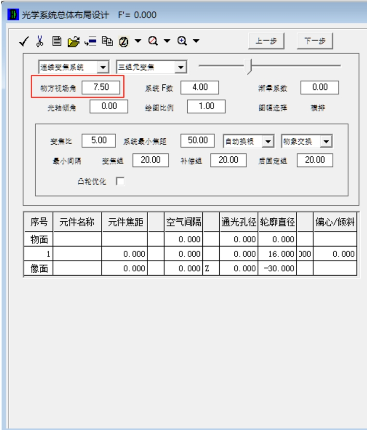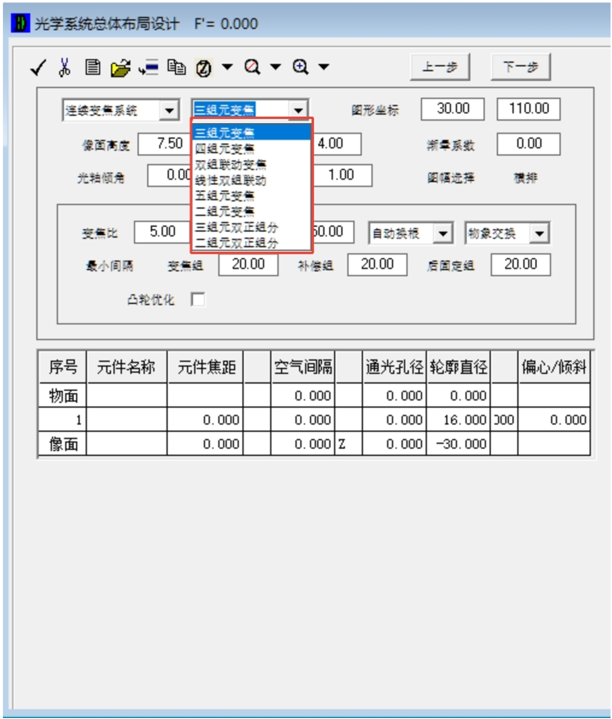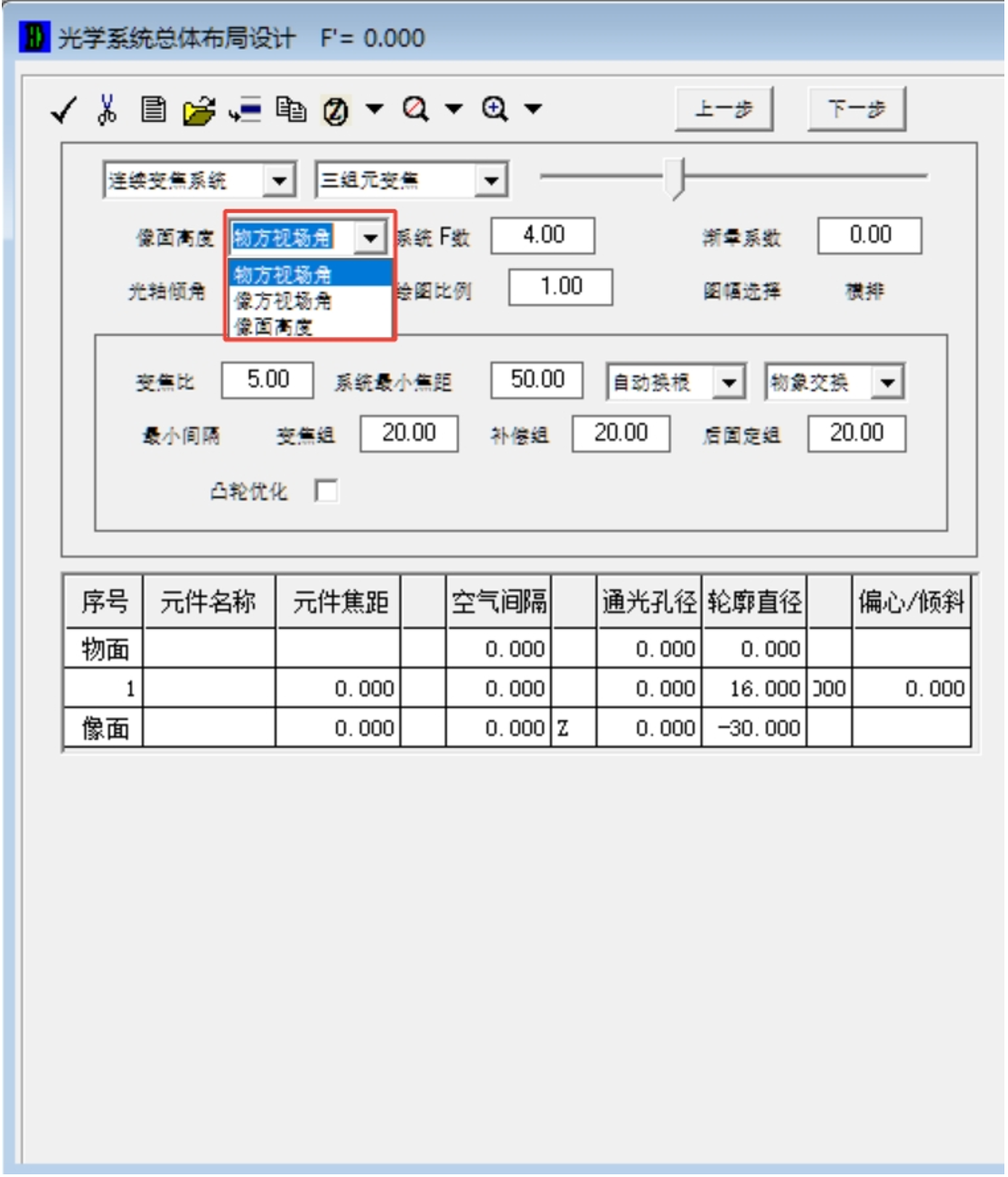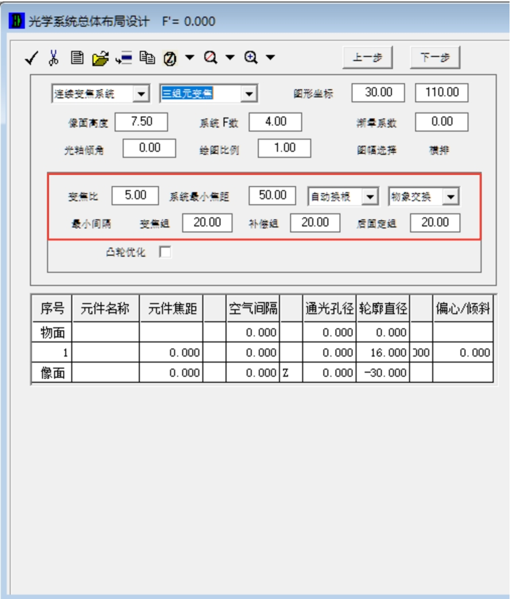 此外,界面上還會(huì)顯示連續(xù)變焦系統(tǒng)的可選方框。在此框內(nèi)可以根據(jù)設(shè)計(jì)要求填寫變焦系統(tǒng)的變焦比、系統(tǒng)最小間距以及各組分間最小間隔距離等。