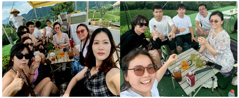 8月3日上午,團(tuán)隊(duì)前往安吉白茶觀景臺(tái)。大巴一到站,平日埋頭工作的同事們立刻像出籠的小鳥(niǎo),興致勃勃地漫步山間小路,呼吸著沁人的茶香。站在觀景臺(tái)上,眼前是一望無(wú)際、連綿起伏的翠綠茶園。這片被人民日?qǐng)?bào)點(diǎn)贊、生動(dòng)展現(xiàn)“綠水青山就是金山銀山”理念的地方,其壯美的景色令人心曠神怡。大家在茶園里悠閑地品茶,感受這份寧?kù)o和美好。
