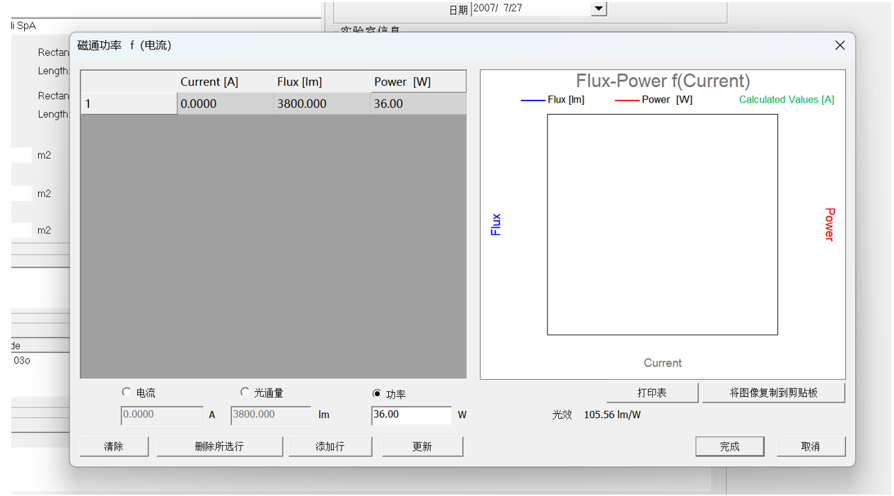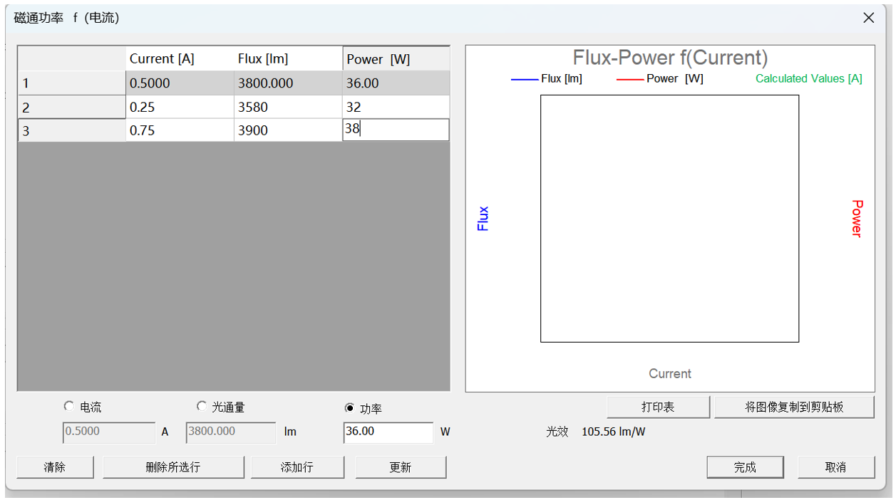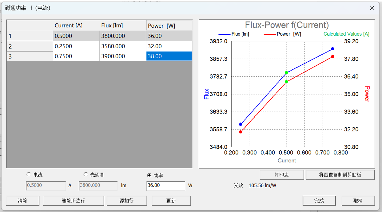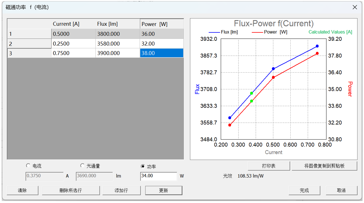 將功率改為34W后,點擊更新,可以查看在此條件下的光通量和電流,點擊完成,保存為OXL文件(保存其它文件格式時,只能保留一組數(shù)據(jù)),保存后,再次導入時可以看到完整的數(shù)據(jù)