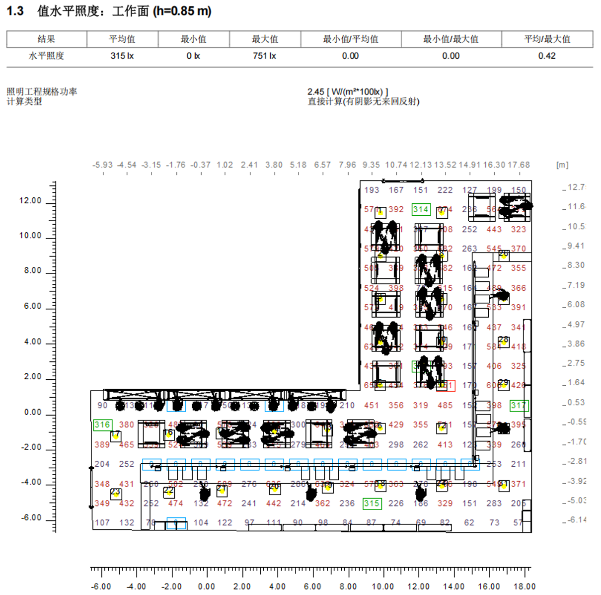 數(shù)值圖顯示區(qū)域照度為300-700lx。