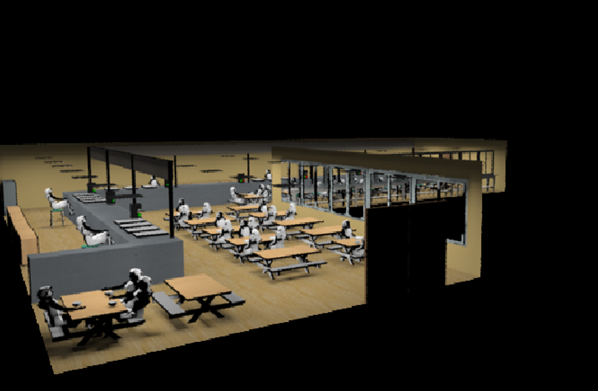 該渲染圖呈現(xiàn)了一個光線分布均衡、燈具擺放合理的學(xué)校餐廳場景,增強了場景的真實感。