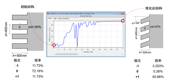 通過高速物理光學(xué),可以對1D和2D微納光柵進(jìn)行嚴(yán)格的電磁分析,獲得相應(yīng)的近場、衍射級次以及衍射效應(yīng),同時能夠?qū)鈻胚M(jìn)行優(yōu)化,以獲得所需要光柵結(jié)構(gòu)參數(shù)并集成到整個光學(xué)系統(tǒng)中進(jìn)行分析。