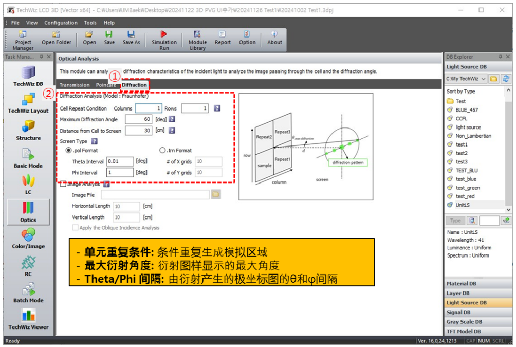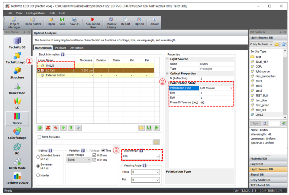 e) ①疊加光源→ ②設(shè)置偏振類型(左旋圓偏光)→ ③ 設(shè)置波長