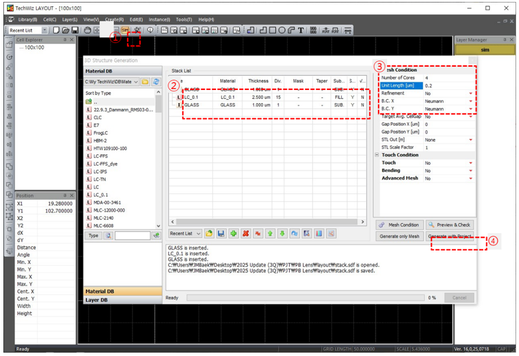 b) ① SIM (生成) → ②堆棧層并設(shè)置厚度→ ③設(shè)置網(wǎng)格條件→ ➃ 生成網(wǎng)格